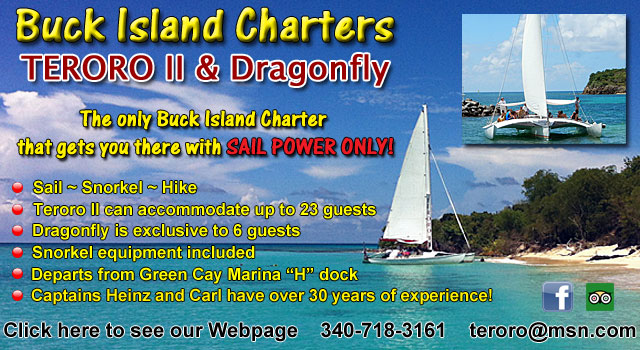 Buck Island Reef National MonumentThis is an 850-acre national park. In fact, it is the first national park to be located underwater. Two underwater snorkeling trails weave through its Marine Gardens. This is a great place for all snorkelers - beginner to advanced. Many various boating companies offer a variety of excursions to Buck Island. There is also a park with picnic areas. Boats depart from the Wharf area in Christiansted or Green Cay Marina. Half and Full day excursions available. Sailing and Buck Island ToursBig Beards's Adventure Tours - 340-773-4482 - Buck Island Tours, Snorkel Gear & Lessons Included. Full Day or Half Day Sunset Sails, Weddings, Private Charters. Full Day Beach BBQ...all you can eat and drink! Buck Island Charters - Teroro II & Dragonfly - 340-718-3161 - Sail with Captains Heinz and Carl to beautiful Buck Island where you can swim, snorkel and hike to the top of the island. Jasmyn Charters - 603-781-9864 Jolly Roger Charters - 340-513-2508 - Sail, Snorkel, Relax! Full and half day tours, Buck Island Trips, East End Snorkel Tours, Sunset Sails, Private Charters. Llewellyn's Charter - 340-773-9027 Lyric Sails St. Croix - 340-201-5227 - St. Croix's Newest Excursion! Lyric Sails is now offering private day sailing charters out of Frederiksted. We can take groups from 1-25 people. Rates start at $75 per person for a half-day trip, $100 per person for a full day trip. Itinerary is customizable and includes sailing, snorkeling shipwrecks and reefs, and just relaxing in the calm, tropical waters of Frederiksted. Snacks (half-day) and lunch (full day) and beverages are included. We also feature Sunset Sails and Moonlight Sails with live music! Full Bar. Yoga Cruise. Private Charter, Weddings. Book online at LyricSails.com St. Croix Yacht Club